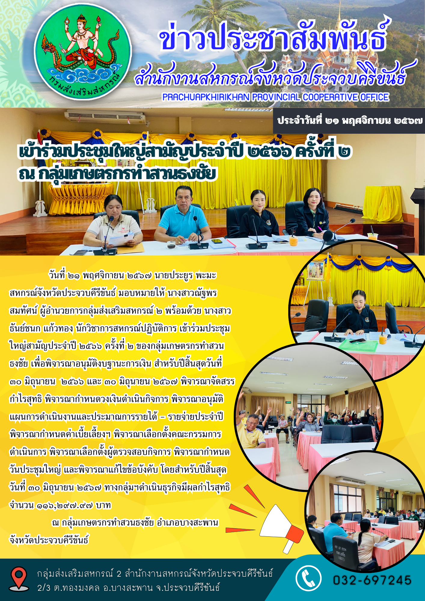 วันที่ ๒๑ พฤศจิกายน ๒๕๖๗ นายประยูร พะมะ สหกรณ์จังหวัดประจวบคีรีขันธ์ มอบหมายให้ นางสาวณัฐพร สมทัศน์ ผู้อำนวยการกลุ่มส่งเสริมสหกรณ์ ๒ พร้อมด้วย นางสาวธันย์ชนก แก้วทอง นักวิชาการสหกรณ์ปฏิบัติการ เข้าร่วมประชุมใหญ่สามัญประจำปี ๒๕๖๖ ครั้งที่ ๒ ของกลุ่มเกษตรกรทำสวนธงชัย เพื่อพิจารณาอนุมัติงบฐานะการเงิน สำหรับปีสิ้นสุดวันที่ ๓๐ มิถุนายน ๒๕๖๖ และ ๓๐ มิถุนายน ๒๕๖๗ พิจารณาจัดสรรกำไรสุทธิ พิจารณากำหนดวงเงินดำเนินกิจการ พิจารณาอนุมัติแผนการดำเนินงานและประมาณการรายได้ - รายจ่ายประจำปี พิจารณากำหนดค่าเบี้ยเลี้ยงฯ พิจารณาเลือกตั้งคณะกรรมการดำเนินการ พิจารณาเลือกตั้งผู้ตรวจสอบกิจการ พิจารณากำหนดวันประชุมใหญ่ และพิจารณาแก้ไขข้อบังคับ โดยสำหรับปีสิ้นสุดวันที่ ๓๐ มิถุนายน ๒๕๖๗ ทางกลุ่มฯดำเนินธุรกิจมีผลกำไรสุทธิ จำนวน ๑๑๖,๒๙๗.๙๗ บาท ณ กลุ่มเกษตรกรทำสวนธงชัย อำเภอบางสะพาน จังหวัดประจวบคีรีขันธ์