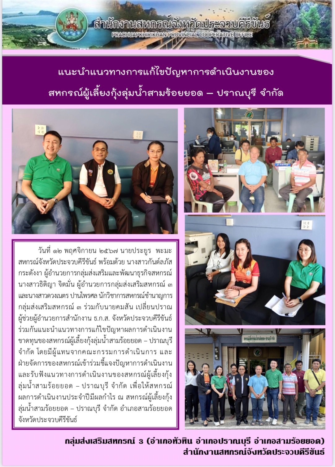 วันที่ ๑๒ พฤศจิกายน ๒๕๖๗ นายประยูร พะมะ สหกรณ์จังหวัดประจวบคีรีขันธ์ พร้อมด้วย นางสาวกันต์ลภัส กระดังงา ผู้อำนวยการกลุ่มส่งเสริมและพัฒนาธุรกิจสหกรณ์,นางสาวธิติญา จิตมั่น ผู้อำนวยการกลุ่มส่งเสริมสหกรณ์ ๓ และนางสาวดวงเนตร ปานไพรศล นักวิชาการสหกรณ์ชำนาญการ กลุ่มส่งเสริมสหกรณ์ ๓ ร่วมกับ นายคมสัน เปลี่ยนปราณ ผู้ช่วยผู้อำนวยการสำนักงาน ธ.ก.ส. จังหวัดประจวบคีรีขันธ์ ร่วมกันแนะนำแนวทางการแก้ไขปัญหาผลการดำเนินงานขาดทุนของสหกรณ์ผู้เลี้ยงกุ้งลุ่มน้ำสามร้อยยอด – ปราณบุรี จำกัด โดยมีผู้แทนจากคณะกรรมการดำเนินการ และ ฝ่ายจัดการของสหกรณ์เข้าร่วมชี้แจงปัญหาการดำเนินงาน และรับฟังแนวทางการดำเนินงานของสหกรณ์ผู้เลี้ยงกุ้ง ลุ่มน้ำสามร้อยยอด – ปราณบุรี จำกัด เพื่อให้สหกรณ์ ผลการดำเนินงานประจำปีมีผลกำไร ณ สหกรณ์ผู้เลี้ยงกุ้ง ลุ่มน้ำสามร้อยยอด – ปราณบุรี จำกัด อำเภอสามร้อยยอด จังหวัดประจวบคีรีขันธ์
