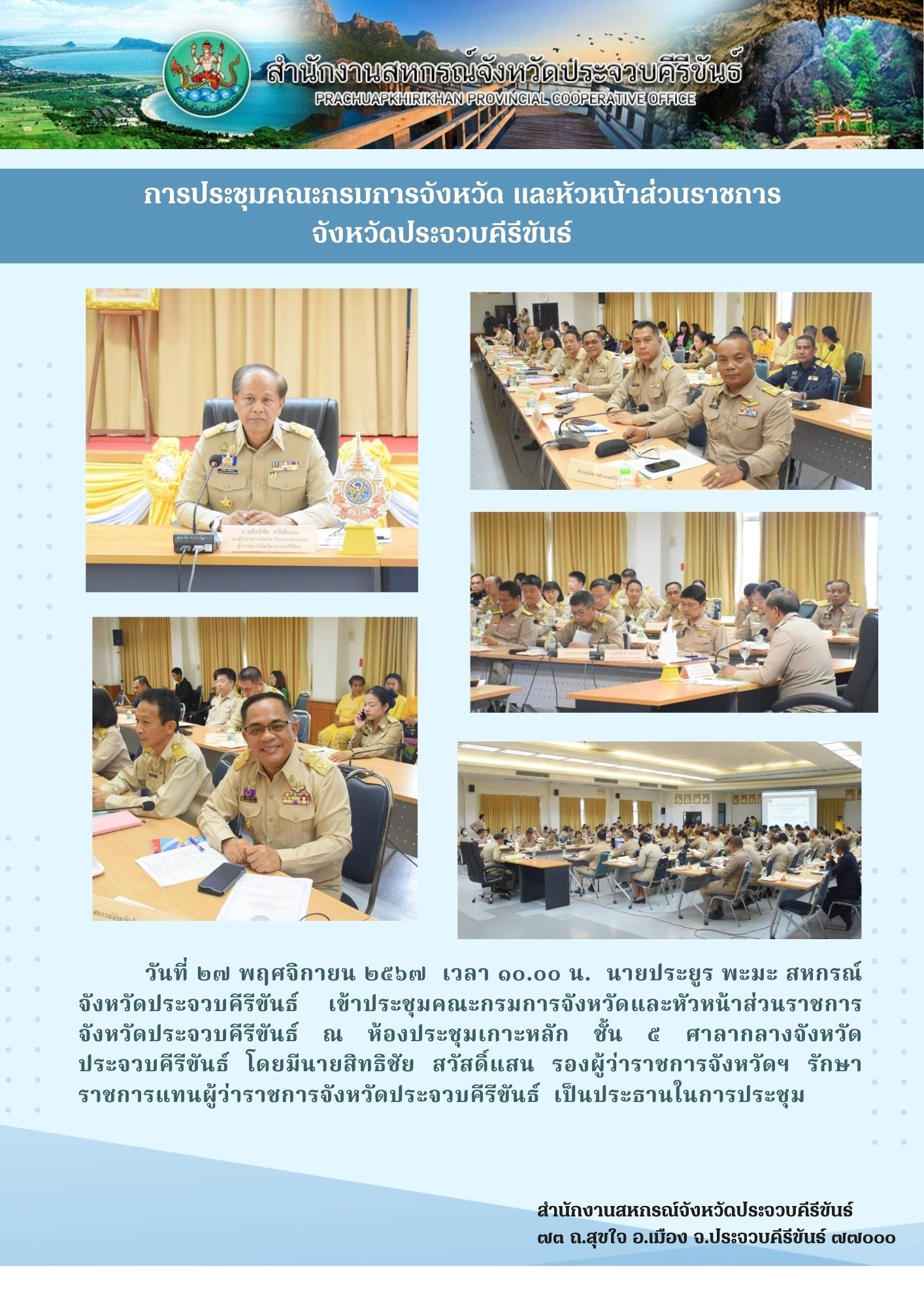 วันที่ ๒๗ พฤศจิกายน ๒๕๖๗ เวลา ๑๐.๐๐ น. นายประยูร พะมะ สหกรณ์จังหวัดประจวบคีรีขันธ์ เข้าประชุมคณะกรมการจังหวัดและหัวหน้าส่วนราชการจังหวัดประจวบคีรีขันธ์ ณ ห้องประชุมเกาะหลัก ชั้น ๕ ศาลากลางจังหวัดประจวบคีรีขันธ์ โดยมีนายสิทธิชัย สวัสดิ์แสน รองผู้ว่าราชการจังหวัดฯ รักษาราชการแทนผู้ว่าราชการจังหวัดประจวบคีรีขันธ์ เป็นประธานในการประชุม