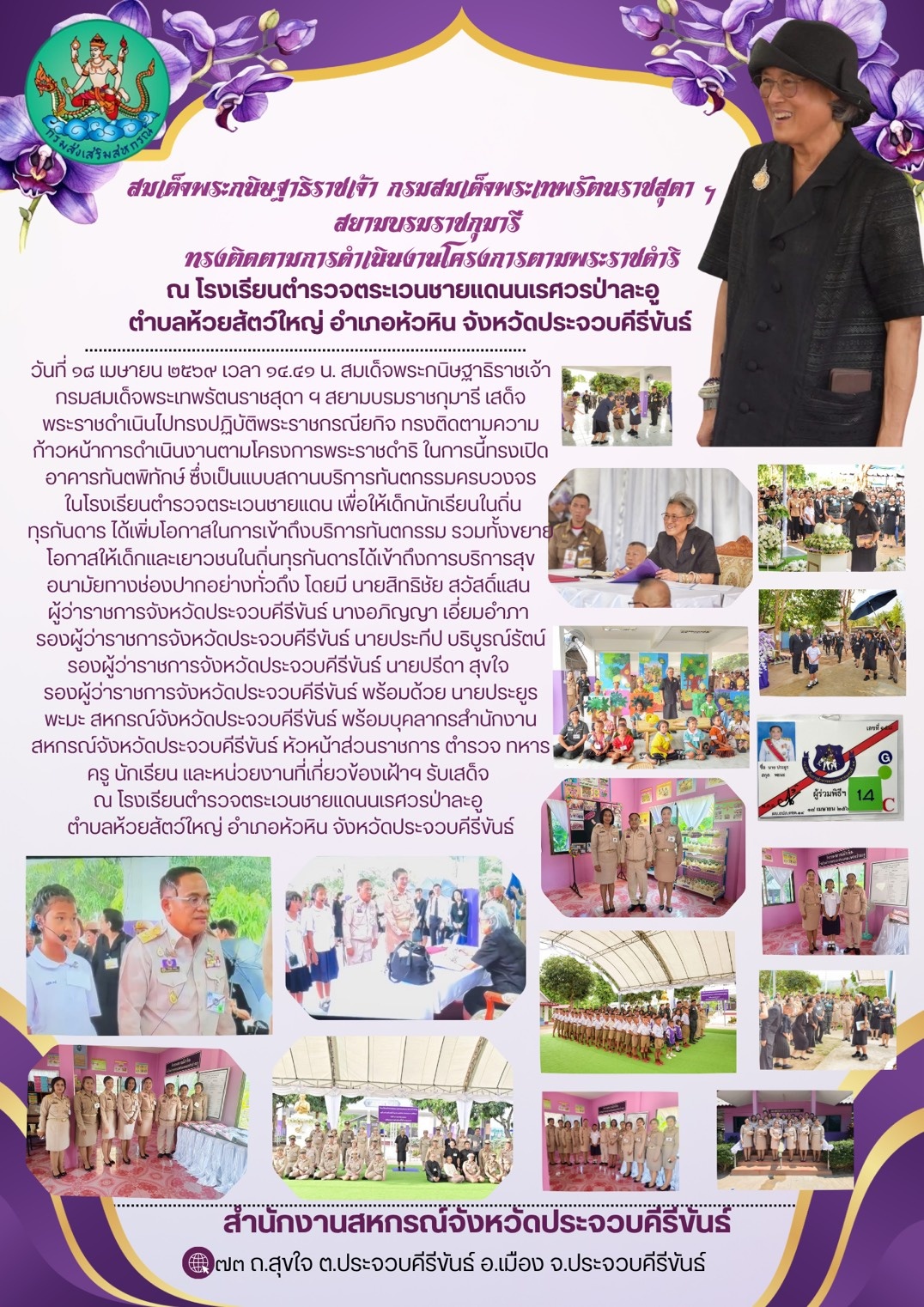วันที่ ๑๘ เมษายน ๒๕๖๙ เวลา ๑๔.๔๑ น. สมเด็จพระกนิษฐาธิราชเจ้า กรมสมเด็จพระเทพรัตนราชสุดา ฯ สยามบรมราชกุมารี เสด็จพระราชดำเนินไปทรงปฏิบัติพระราชกรณียกิจ ทรงติดตามความก้าวหน้าการดำเนินงานตามโครงการพระราชดำริ ในการนี้ทรงเปิดอาคารทันตพิทักษ์ ซึ่งเป็นแบบสถานบริการทันตกรรมครบวงจร ในโรงเรียนตำรวจตระเวนชายแดน เพื่อให้เด็กนักเรียนในถิ่นทุรกันดาร ได้เพิ่มโอกาสในการเข้าถึงบริการทันตกรรม รวมทั้งขยายโอกาสให้เด็กและเยาวชนในถิ่นทุรกันดารได้เข้าถึงการบริการสุขอนามัยทางช่องปากอย่างทั่วถึง โดยมี นายสิทธิชัย สวัสดิ์แสน ผู้ว่าราชการจังหวัดประจวบคีรีขันธ์ นางอภิญญา เอี่ยมอำภา รองผู้ว่าราชการจังหวัดประจวบคีรีขันธ์ นายประทีป บริบูรณ์รัตน์ รองผู้ว่าราชการจังหวัดประจวบคีรีขันธ์ นายปรีดา สุขใจ รองผู้ว่าราชการจังหวัดประจวบคีรีขันธ์ พร้อมด้วย นายประยูร พะมะ สหกรณ์จังหวัดประจวบคีรีขันธ์ พร้อมบุคลากรสำนักงานสหกรณ์จังหวัดประจวบคีรีขันธ์ หัวหน้าส่วนราชการ ตำรวจ ทหาร ครู นักเรียน และหน่วยงานที่เกี่ยวข้องเฝ้าฯ รับเสด็จ ณ โรงเรียนตำรวจตระเวนชายแดนนเรศวรป่าละอู ตำบลห้วยสัตว์ใหญ่ อำเภอหัวหิน จังหวัดประจวบคีรีขันธ์